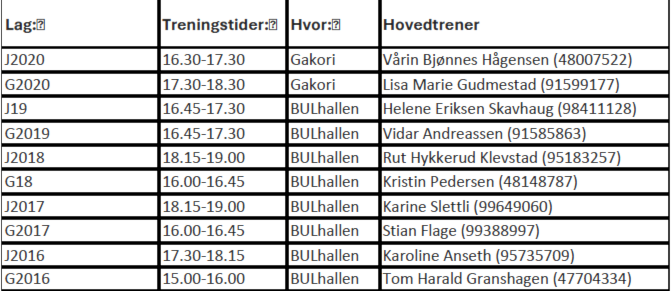 Tirsdag 07.10.2025 starter barneidretten opp med handballtrening. Legger ved treninigstider for de forskjellig årskullene.